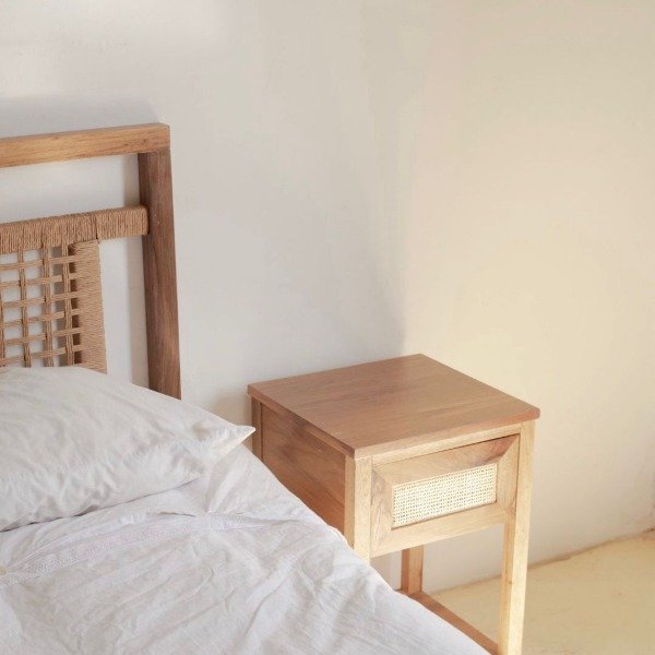 Mesa de luz Petiribi con su estructura maciza y su tapa enchapada.